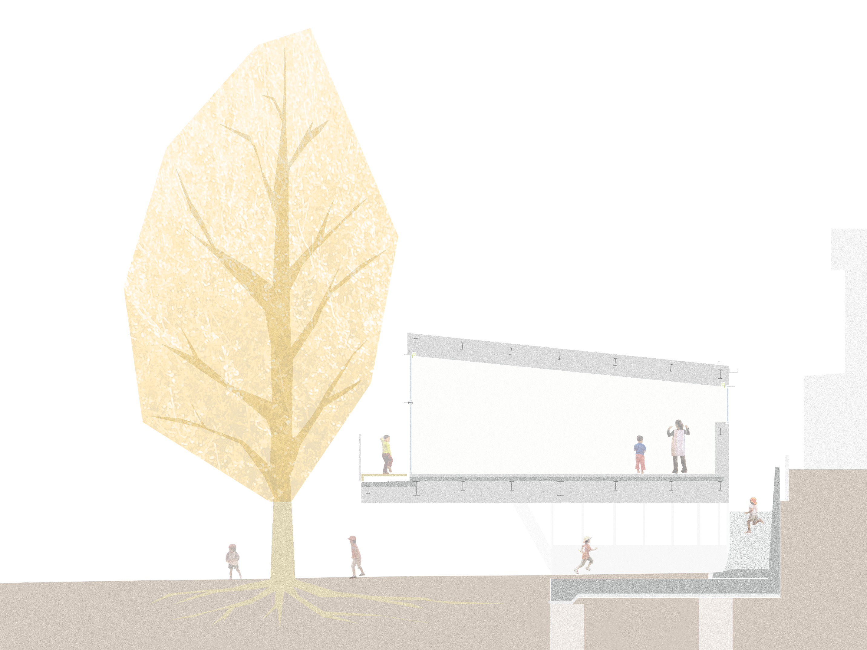 私立幼稚園の園庭に新設された遊戯室棟です。既存のイチョウの根に配慮して、遊戯室を2階に配し、1階の半分以上を園庭と連続する無柱のピロティ空間としています。園庭と遊戯室をつなぐ屋外スロープは、遊び場としてだけでなく、車椅子やバギーの利用にも配慮しました。ファサードを覆うイチョウの落葉や紅葉は、日射コントロールの役割を担うとともに、季節ごとに子供達の日常を彩ります。